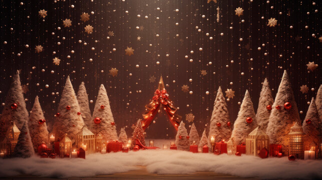Illuminated christmas trees forest in on a snowy night close to christmas decorations in an artificial stage at twilight, Generative AI illustration