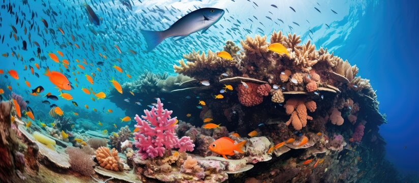 Colorful coral reef with numerous glass fish at the SS Yongala shipwreck in the Great Barrier Reef Australia