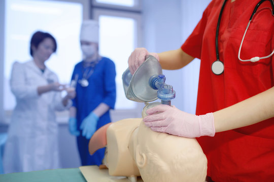 group of medical workers. The concept of the practice of artificial breathing by a young doctor. Forced oxygen delivery to the patient's lungs by a nurse. CPR background