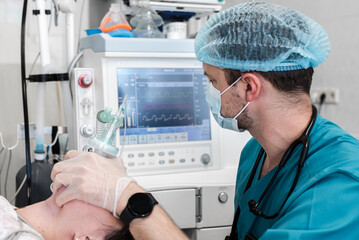 Anesthesiologist gives anesthesia to female patient before operation in a clinic. Anesthetist takes care of anesthesia and ventilation for the patient during the operation