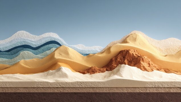 Glossy lips emerging from the sand create a surrealism effect against the vast desert landscape and clear blue sky.
