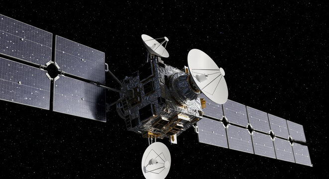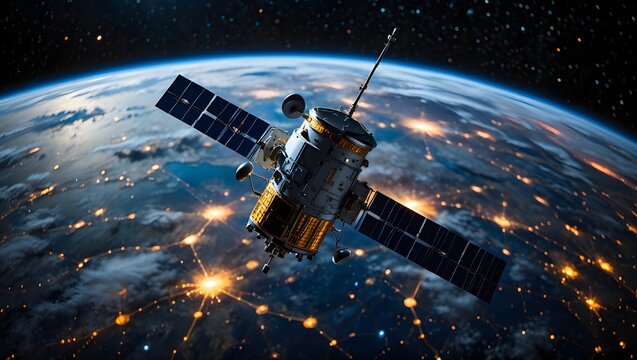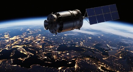 Satellite reflecting sunlight while orbiting earth with starry sky