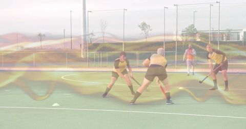 Field hockey players positioning on turf in pink and yellow kits with angled grid overlay