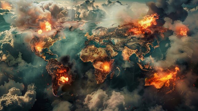 A world map in war with military targets where explosions, fire and bombings occur. Hot atlas for climate change and danger of conflict between countries continents.