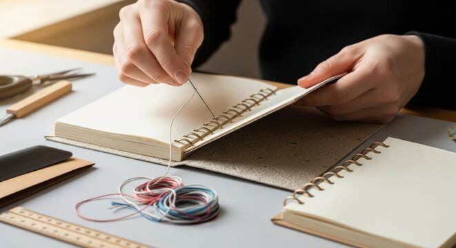 A cozy bookbinding workshop with antique tools, Leather-bound books in various stages of binding, Historical artisan style