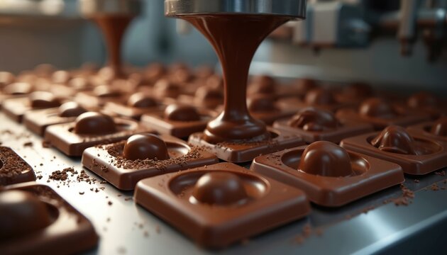 Automated chocolate molding machine pours liquid chocolate into detailed molds. Manufacturing, food, industry, technology, sweet desserts, candy, baking, culinary process, machinery.