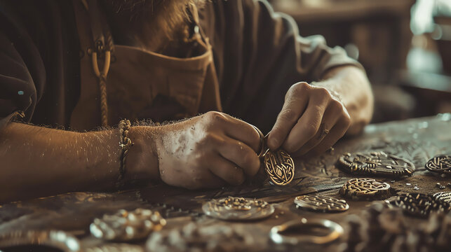 Artisan crafting Viking jewelry in a historical village, using ancient techniques to forge intricate brooches and necklaces, preserving cultural heritage.