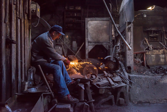 Authentic blacksmith man forges a metal product in dark indoors studio