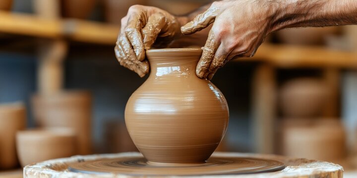 Close-up of hands shaping a clay pot on a pottery wheel with clay and spinning wheel in workshop setting