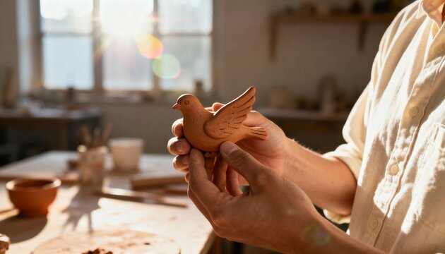 Person holding handmade brown ceramic bird figurine in sunlit pottery studio