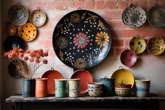 Handcrafted pottery on shelf in artisan workshop