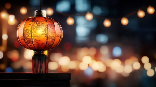 Vibrant Paper Lantern Illuminating Night Market with Bokeh Background and Warm Glow Effect