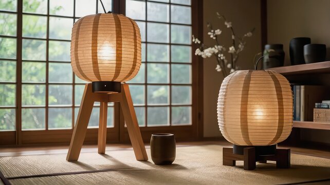A traditional Japanese room features tatami floor, wooden furniture, soft lighting from a paper lantern, creating a serene and minimalist atmosphere.