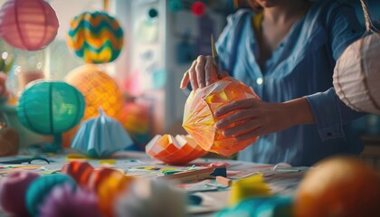 Picture of artisan fold paper to make lantern at workshop. Skillful artist create origami artwork for decoration by colorful paper. Crafting handmade art with artistic tool and creativity idea. AIG61.