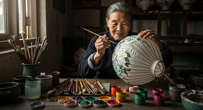 An elderly Asian artisan meticulously hand-painting a traditional lantern, a timeless moment of cultural craftsmanship and dedication.