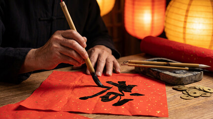 Close-up of senior man's hands writing Chinese character "fu", which means "fortune", for New Year on red paper