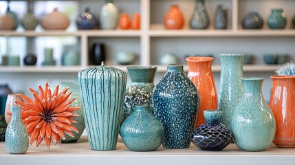 Colorful handcrafted pottery varieties displayed on a shelf in an artisan studio setting