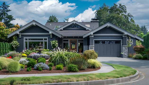 Stylish suburban Craftsman house painted in charcoal gray, with a well-maintained garden and a spacious driveway