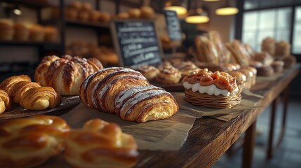 Traditional European pastries displayed on a rustic wooden table in a cozy countryside bakery, with a warm and inviting atmosphere.