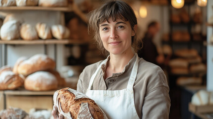 Smiling female baker holding freshly baked artisan bread in cozy bakery. Baker standing in bakery with loaf of unleavened bread. small business bakery and bread shop