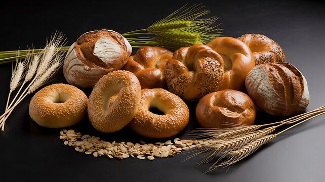 Artisanal bread rolls in wicker baskets at rustic market stall