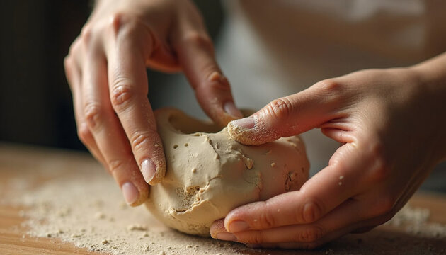 Hands kneading dough on wooden surface in home kitchen