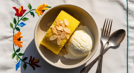 A bowl of moist yellow cake topped with almond flakes served with a scoop of vanilla ice cream, set on a floral embroidered tablecloth.