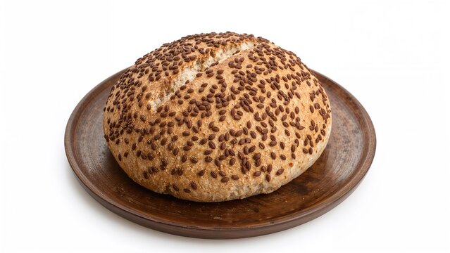Bread roll with sesame seeds on a wooden plate