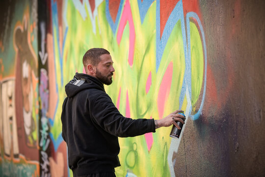 Graffiti artist painting colorful urban mural with spray paint
