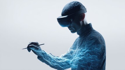 Artist in a side profile view intently drawing animated visuals with a VR stylus in a dimly lit pit the foreground sharply detailed with a blurred futuristic setup behind.