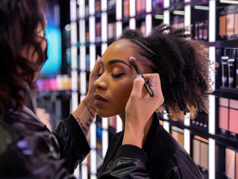 Young pretty woman chosing color cosmetic and beauty consultant in shop or beauty salon