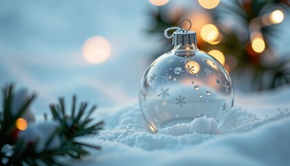 Clear Christmas ornament with snowflake design resting on snow with glowing lights in the background