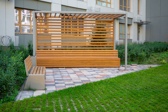 Wooden pergola with built-in bench in landscaped courtyard. Modern outdoor seating for residential or urban relaxation. Photo