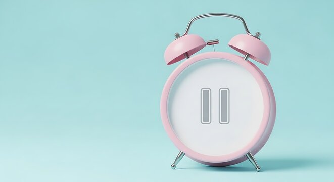 A pink alarm clock with a pause symbol on its face, set against a light blue background, creating a calming aesthetic