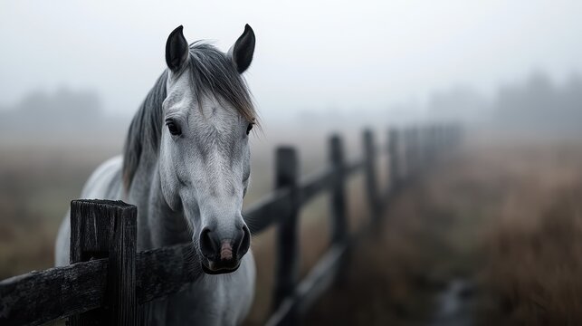 In the gentle embrace of a foggy dawn, a gray horse leans on a wooden fence, creating a tranquil and melancholic scene that captures the serene and contemplative beauty of nature.