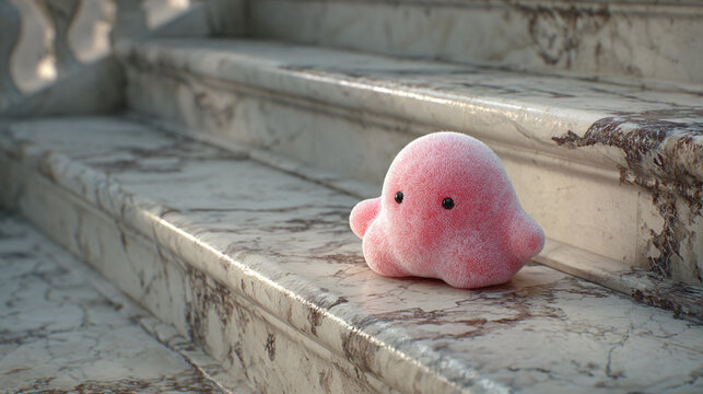 A cute pink creature on marble stairs, a whimsical and artistic concept