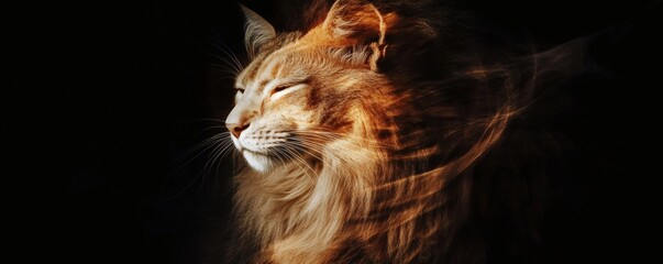 Glowing feline profile emitting golden whiskers turning into sparkling particles on black