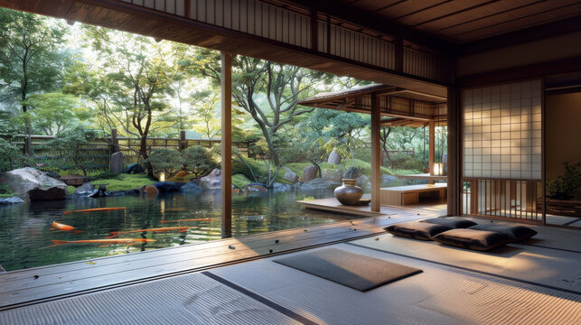 A beautiful Japanese tea house with tatami mats and a view of a tranquil koi pond