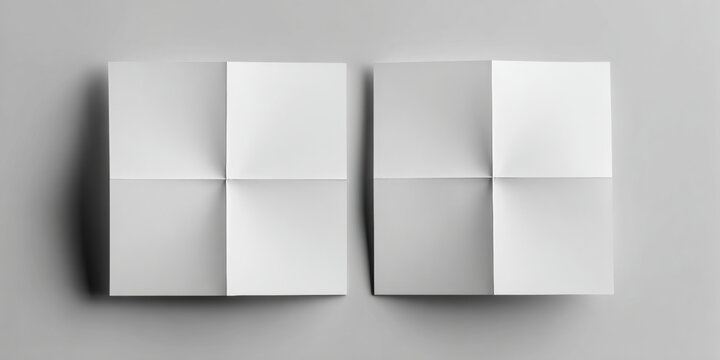 Four folded sheets of blank white paper, arranged in a grid format, clean white tone. The showcasing the creases in the paper. on gray background. suitable for a mockup or template.