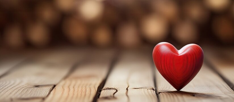 A bright red heart contrasts against a rustic wooden floor, creating a striking visual contrast. The heart appears to be delicately placed on the floor, drawing attention to its vibrant color and the