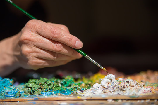 Caucasian male artist painting in sunlit studio with creative atmosphere