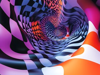 Psychedelic Checkerboard Vortex: Immerse yourself in a mesmerizing 3D render of a swirling checkerboard pattern, creating a psychedelic tunnel of vibrant purples, oranges, and blacks.