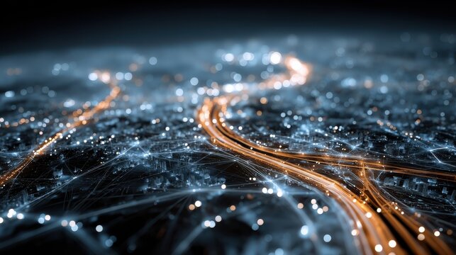 A mesmerizing aerial view of a city at night, showcasing illuminated roads and vibrant urban landscapes with a network of lights.