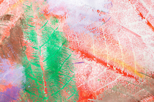 White , purple and green acrylic paint imprint with leaves pattern  on red background paper
