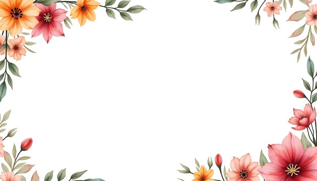 A seamless watercolor floral border with a variety of vibrant flowers and subtle greenery, designed to frame text or images on a white background