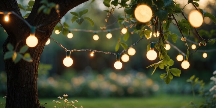 Bokeh Outdoor String Lights Illuminating Tree Branches in Garden Setting with Softly Blurred Background and Space for Text Overlay