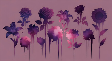 Moody purple roses, lilies, sunflowers, and blossoms dripping with color create a dramatic, artistic vibe perfect for backgrounds and designs