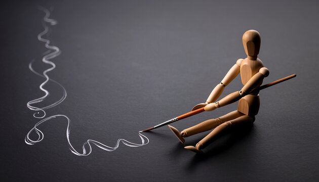 Wooden artists' mannequin engages in creative exploration