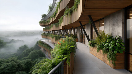 Artists rendering of a green curved building overlooking a misty forest. Ideal for environmental, architectural, or urban concept designs.