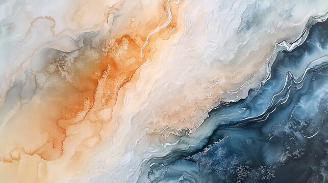 Abstract painting with fluid art texture, featuring a blend of orange, white, and blue hues in a dynamic swirl
